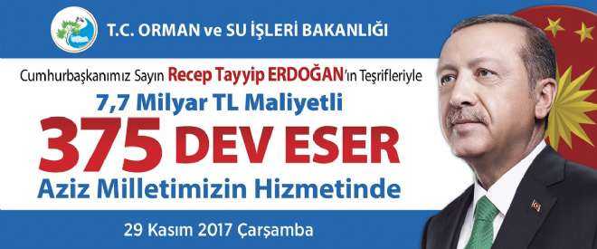 Orman ve Su İşleri Bakanlığı bir gelenek haline getirdiği toplu açılış merasimlerine bu yıl da devam ediyor. Bu çerçevede Orman ve Su İşleri Bakanlığı tarafından ülke genelinde yapımı tamamlanan 7,7 milyar lira yatırım bedelli 375 eser hizmete alınacak. 29 Kasım Çarşamba günü Ankara’da Cumhurbaşkanı Recep Tayyip Erdoğan tarafından toplu olarak hizmete alınacak eserlerden Ordu da payını alacak.