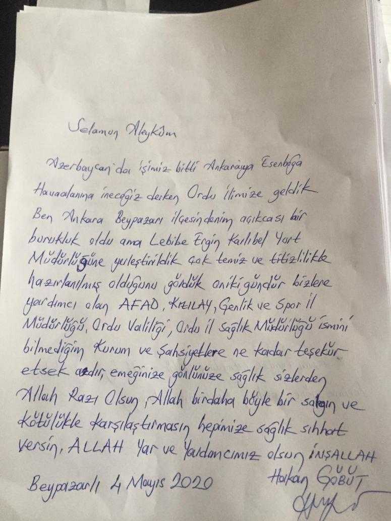 Rusya ve Azerbaycan’dan getirilen vatandaşlarımız, kendilerine bu süreçte destek olan devlet yetkilileri ve Ordu'daki yurt görevlilerine teşekkür ettikleri mektuplarında, Ordu’da kaldıkları süre içerisinde hayatları boyunca unutamayacakları anılar biriktirdiklerini ifade ettiler.