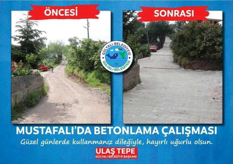 2020 yılı yol betonlama çalışmalarına aralıksız bir şekilde devam eden ekiplerimiz Mustafalı Mahallesi İmamlı semtinde gerçekleştirilen çalışmayla vatandaşların yıllardır beklediği yol hasretine son verdi. Ordu Valiliğinin YİKOB aracılığıyla ilçelerde gerçekleştirdiği yol çalışmaları kapsamında ilçemize ayırdığı betonlama çalışmalarının Mustafalı Mahallemizde tamamlanmasının ardından kalan kısımlar belediyemizce tamamlanarak vatandaşlarımızın hizmetine sunuldu.