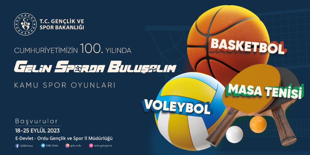 Cumhuriyetimizin 100. Yılında Kamu Kurum ve Kuruluşları Arasında Spor Karşılaşmaları Yapılacak. Ordu Gençlik ve Spor İl Müdürlüğü tarafından organize edilecek müsabakalar masa tenisi, basketbol ve voleybol branşlarında gerçekleştirilecek.