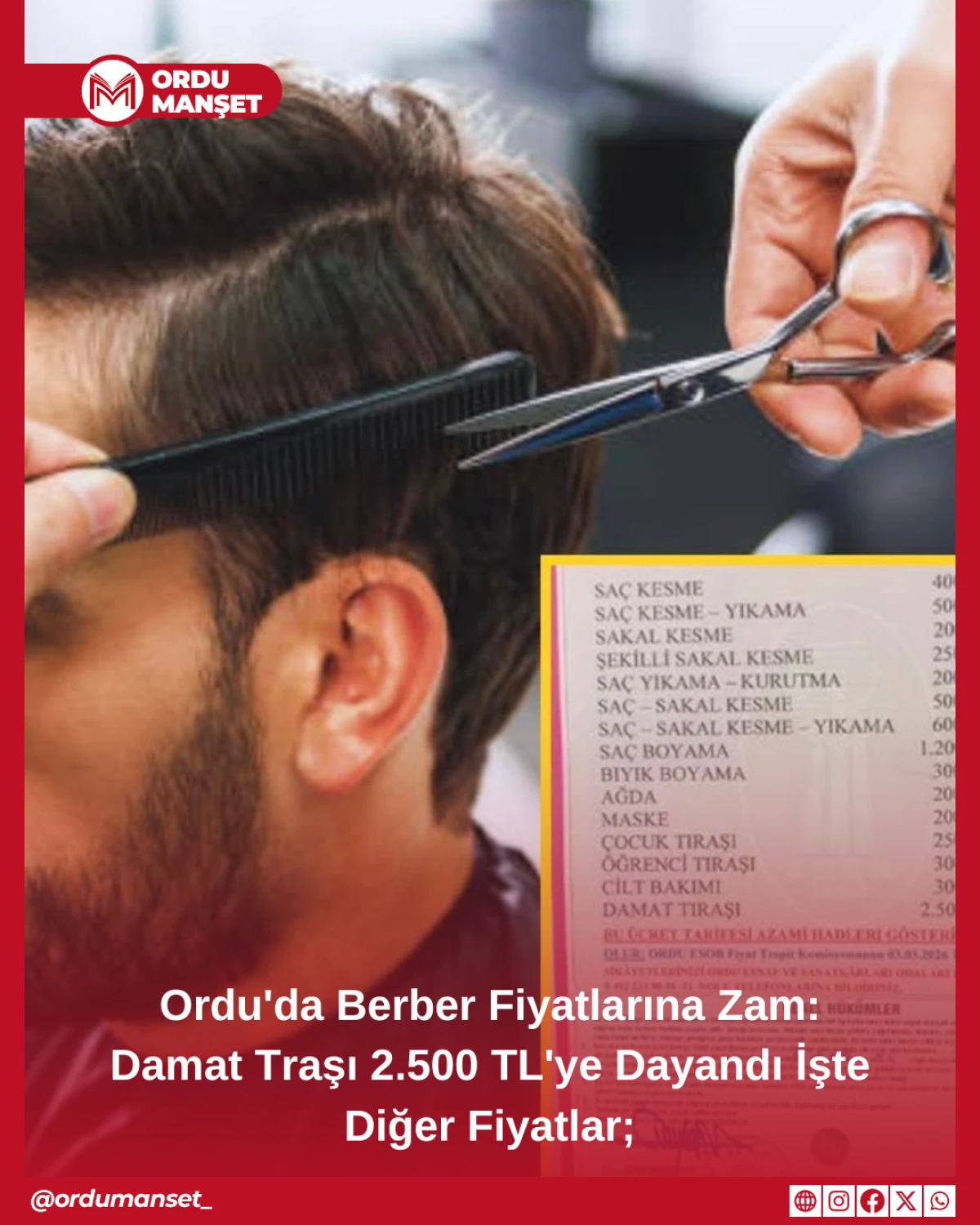 Altınordu, Gülyalı ve Kabadüz ilçelerinde geçerli yeni tarifeye göre saç-sakal kesimi ve yıkama 600 TL'ye yükseldi. Damat tıraşı ise 2.500 TL oldu.