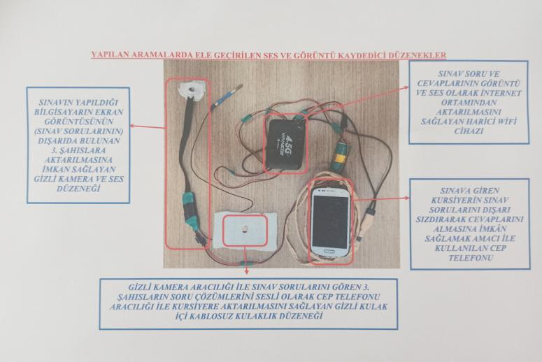 Yapılan aramalarda, başka şahıslara ait kimlik fotokopileri, biometrik fotoğraflar, sınavda kopya çekme amacıyla kullanıldığı değerlendirilen ses ve görüntü düzeneği ele geçilmiştir.