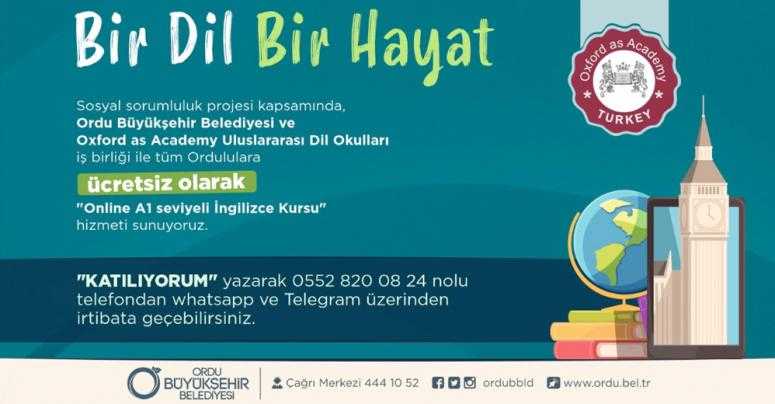 Ordu Büyükşehir Belediyesi Kültür, Sanat ve Turizm Dairesi Başkanlığı, sosyal sorumluluk projesi kapsamında, dileyen herkese İngilizce öğretmek üzere başlanan online derslerin ikincisi düzenlenecek. Oxford as Academy Uluslararası Dil Okulları İşbirliği ile uzman eğitmenler tarafından, pandemi kurallarına uygun olarak internet üzerinden verilen kurslar için başvurular başladı. Kursa katılmak isteyenler, 0552 820 08 24 nolu telefondan whatsapp ve telegram üzerinden ‘KATILIYORUM’ yazarak kayıt yaptırabilecek. Son tarih ise 23 Temmuz.