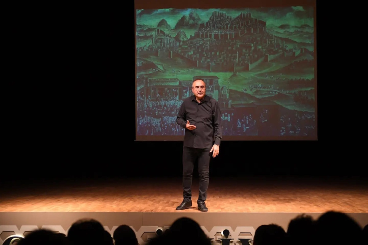 Yoğun ilginin olduğu etkinlikte alkışlar arasında sahneye çıkan Sunay Akın, gösterisine Ulu Önder Gazi Mustafa Kemal Atatürk’ün “Türkiye Cumhuriyeti’nin temeli kültürdür” sözüyle başladı. Ardından kültürden sanata, tarihten günümüze birçok hikaye anlatan Sunay Akın, izleyicilerine keyifli dakikalar yaşattı. Tarihte doğru bilinen yanlışları ve Türkiye tarihine ışık tutan bilgileri kendine has üslubuyla aktaran Sunay Akın,  “Geçmişteki bilgiyi bilgi yapan insandır. Bilginin ışığında yürüyen insandır. 1585 tarihinde biz en doğru gökyüzü haritalarının yapıldığı rasathaneyi uğursuz diye yıkıyoruz. Biz ancak 1923 yılında Cumhuriyet’ten sonra tekrar yıldızlara bakmaya başlıyoruz. 1585-1923 yılları arasında geçen zamanda yıldızlara biz hiç bakmadık. Öyleyse 100’üncü yaşını kutladığımız Cumhuriyet bu topraklarda gökyüzüne, yıldızlara yeniden bakmanın adıdır” dedi.