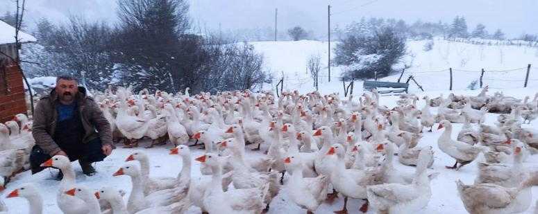 Ordu’nun Kumru ilçesinde kaz yetiştiriciliği yapan Adem Zengince, kar kalınlığının 60 santime ulaştığı 1600 rakımlı Teknecük Obası’nda, 1500 kaz ile birlikte yaşıyor. 100 kaz ile başladığı işletmesini kısa sürede 1500’e çıkaran Zengince, önceki yıllarda sadece yazları konakladıkları yaylada, proje sonrası 12 ay yaşamaya başladıklarını söyledi.